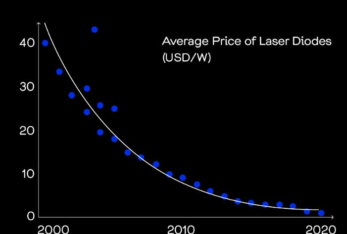 The comparisons above have to be taken with more than a grain of salt, though. NIF was commissioned in 2009 and laser technology has come a long way since then. “[T]he flashlamps that energise NIF’s 192 laser beams have been surpassed by diode-energised lasers. The newer diode lasers are around twenty to forty times more efficient and produce less waste heat.”1 They are also able to fire more rapidly and have fallen astonishingly in cost.