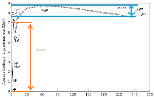 There are two physical processes to release nuclear energy, these are called fusion and fission. In a fusion process, two nuclei are combined into a larger one. Amazingly, the resulting new nucleus is a little bit lighter than its two parents. The difference in mass is emitted via the kinetic energy in neutrons, as charged particles or as photons.