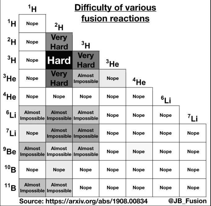 While there are various fuel options available, the vast majority of research has focused on “Deuterium-Tritium” fuel. The reason for that can be seen in the figure below; it’s the “easiest” option. This means that you “only” need to achieve 150 million °C.