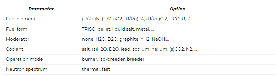 There is an amazingly wide range of possible reactor designs and I will have a look at some of them in future posts. The following table gives an impression of the most important design parameters and the available options: