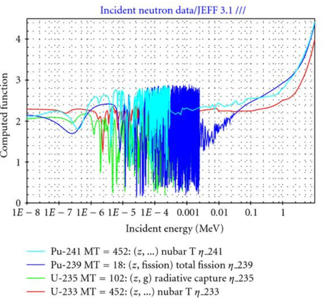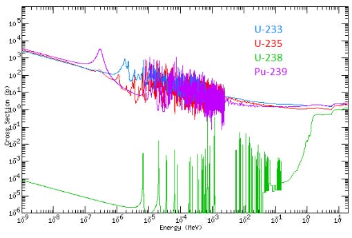 The probability that a neutron hits and splits a nucleus is a function of the neutron energy. As a rule of thumb for fissile materials: the slower the neutrons, the higher the probability that they will fission the nucleus. This can be seen in the following figure in one of the many special units of measurement in the nuclear space: the “barn”. This seems to have been a joke on “as big as a barn door” for something that is only a tiny 10-24 cm² area. The larger the area in “barn” the higher the probability that a neutron will fission the nucleus: