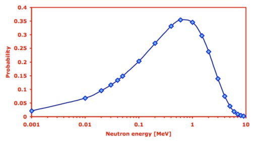 The neutrons that are generated by the fission of each fissile nucleus have a specific distribution of energy. Here is an example of how it looks like for 235U: