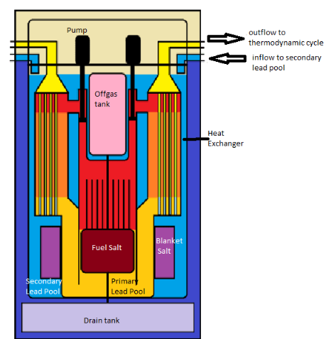 The design features a freeze plug and is supposed to be able to operate on conventional nuclear fuel, as well as a combination of spent nuclear fuel (SNF) and thorium