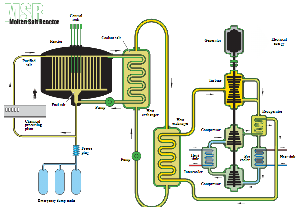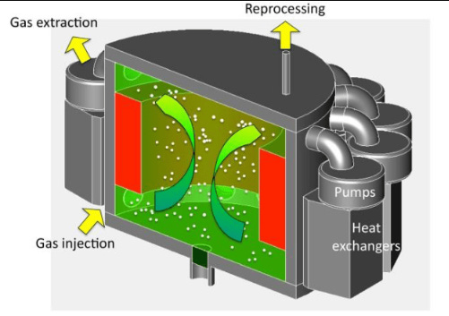 A rather nice feature of this is the ability to drain the moderator, which is an effective way of regulating the reactor’s power output. Their design does not have freeze plug, rather the fuel salt is always draining through open pipes passively into a storage tank. Pumps have to be used to move it through the moderated zone and the heat exchanger. If power to the module gets shut off, the fuel and the moderator are automatically moved to save locations. Another rather interesting feature is the fission product removal stage. Instead of opting for a chemical reprocessing of the fuel salt, it gets sprayed into a low pressure atmosphere after leaving the moderated zone. The volatile fission products are moved with a washing gas to a fission product trap. After that, the cleansed, less volatile fuel salt is repressured and pumped through the heat exchanger.