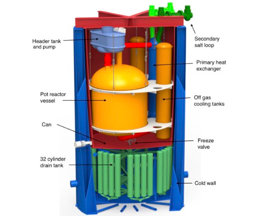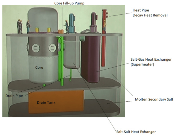 The heat gets transferred to modular, non-cylindrical salt-salt heat exchangers, which ensure high neutron leakage and separation from the core to eliminate criticality concerns. This heat exchangers are also connected to the dump tank so they can passively drain the salt into a safe configuration.