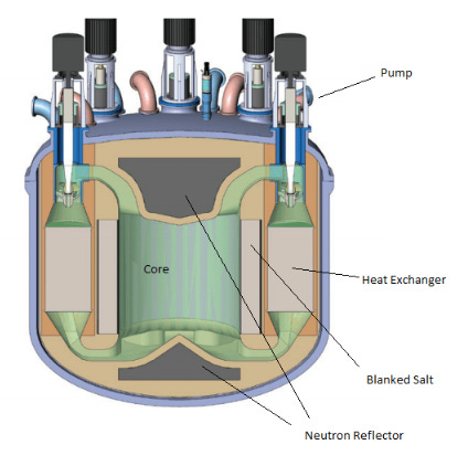 The fuel assemblies in the reactor tank are surround by a clean, fission product and fissile free coolant salt, which does not react violently with air or water.