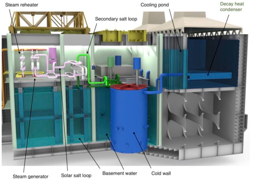 The coolant salt exchanges its heat with a tertiary, solar salt. This salt can be stored in large, thermally insulated tanks. This storage system, called GridReserve, is used to transform the output of this reactor system into a peaking power plant.