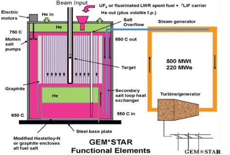 Muons , Inc is developing the GEM*STAR reactor system. It is a thermal spectrum, graphite-moderated, fluoride-salt cooled reactor in a sub-critical configuration. A proton beam is injected on a spallation target in the reactor, which releases enough neutrons to make the reactor critical.