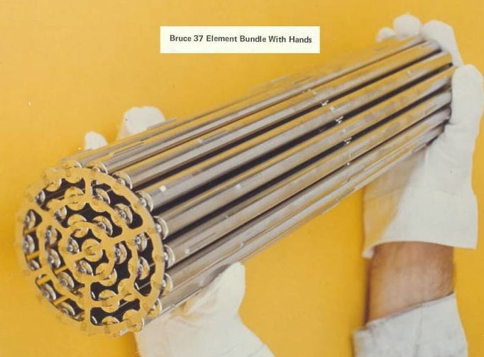Heavy water moderated reactors have their own fuel. The fuel elements of a CANDU reactor are shorter than those of light water reactors. The fuel bundle in the picture will produce enough electricity for a Canadian family of four for about 100 years.