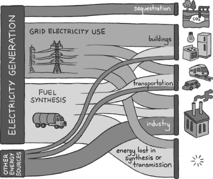 Given that we have some idea about how to get carbon-free power, the general assumption seems to be that this society will have to be primarily powered by electricity, either directly through the grid, or indirectly through some power-to-gas or power-to-liquid synthesis process for clean fuels. As far as we know, some of that society’s power will also have to go towards powering the sequestration of CO2 from the atmosphere. We are not really sure how to go about that, but we either figure it out or will have to bear additional climate related costs. Biofuels, geothermal and CCS will make up the remainder of total energy demand.