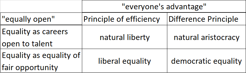 The second principle has two parts, each of which has two independent interpretations, resulting in four possible arrangements for society: